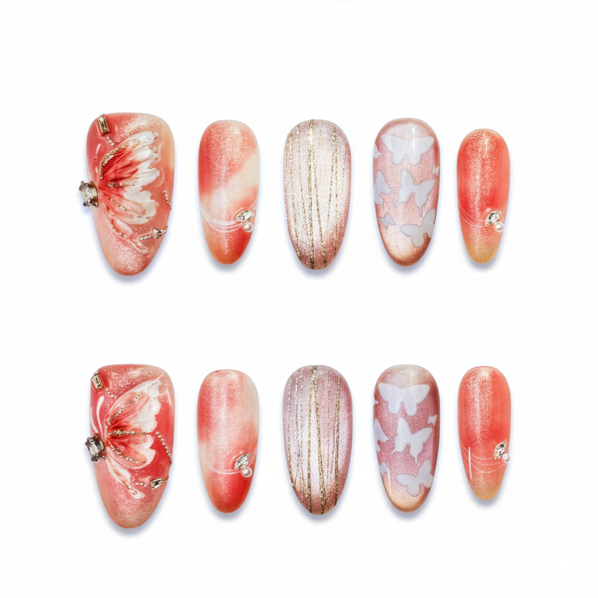 This whimsical set features a stunning gradient from coral to soft lavender, adorned with delicate butterfly motifs and hand-painted floral details. The design showcases artistic variety with dreamy cloud-like swirls, shimmering gold striping tape creating textured vertical lines, and ethereal butterfly silhouettes in periwinkle blue. Crystal embellishments and dimensional 3D butterfly charms add captivating depth to the statement nail. Perfect for nature lovers and free spirits seeking a feminine, transformative design that captures the magic of a sunset garden.